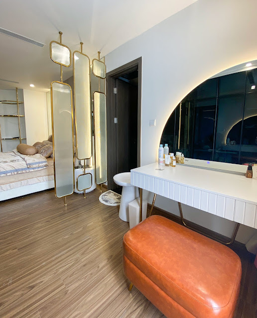 Không gian ngủ nghỉ phân tách với khu vực bàn trang điểm bởi vách lam kính sang trọng.